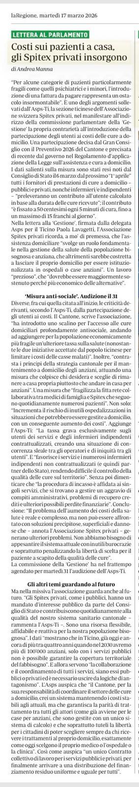Articolo “Costi sui pazienti a casa, gli Spitex privati insorgono” – 17.03.2026